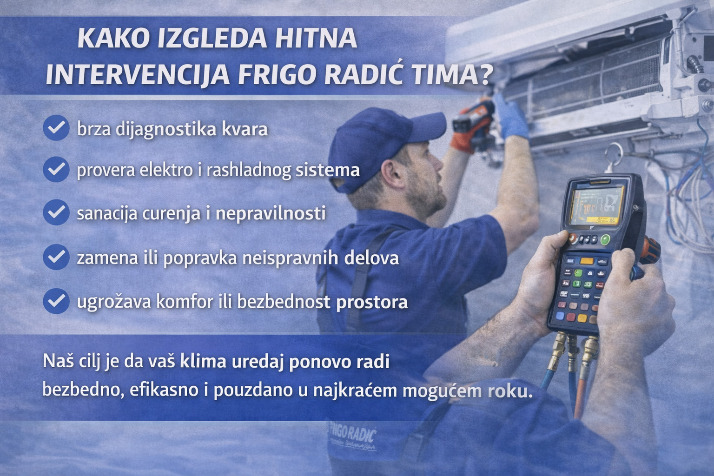 Kada klima uređaj prestane da radi u najgorem mogućem trenutku, potrebna vam je brza i pouzdana hitna intervencija. Frigo Radić nudi hitne intervencije klima uređaja u Beogradu i okolini, kako biste u najkraćem roku vratili prijatnu temperaturu u vaš prostor.
