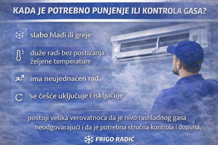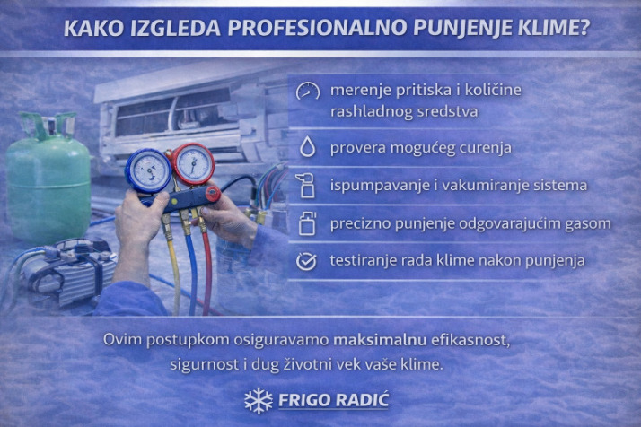 Punjenje i kontrola rashladnog gasa je jedan od najvažnijih koraka u pravilnom radu klima uređaja. U Frigo Radiću nudimo profesionalno punjenje klime u Beogradu i širom Srbije, kako bi vaša klima hladila i grejala punim kapacitetom.
